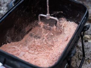 ここが最も重要なポイントです。 沖のポイントへマキエを届けるためには、柄杓(ヒシャク)のカップにマキエを詰め込み、空気を抜いて固める必要があります。