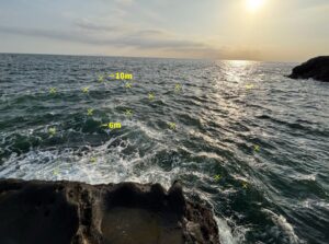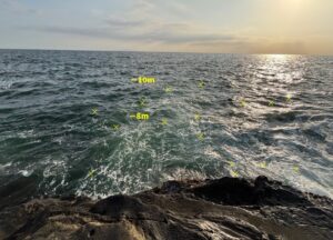 この釣り座は、うねりに非常に弱くすぐに波を被ってしまうので、少しでも波が高い時は釣りを控えるようにしましょう。