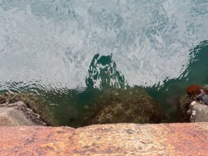 足元の下にこのような空間があり、ここに多くの魚が居着いています。メジナ、黒鯛なども多く潜んでいるので足元で大物と出会える可能性のあるとても面白いポイントです。