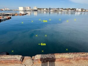 水深は場所によって少しムラはありますが、足元で5〜6m。少し沖で8mほどとかなり深いです。