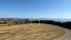 城ヶ島公園の端まで来ると芝生の広場がありますので、黄色の○で示したあたりの階段を下っていきます。