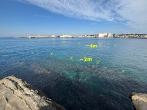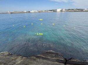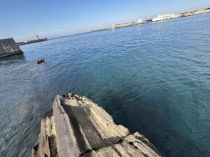 先端より一つ手前の釣り座。足元から徐々に深くなってゆき、10~15mほど先で4mほどの水深になります。
