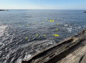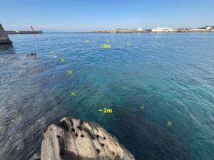 手前には浅いハエ根が張り出しており、20mほど沖でようやく3mほどの水深になります。このような地形なため釣りにはあまり適しておらず釣り人が入ることはあまりありません。