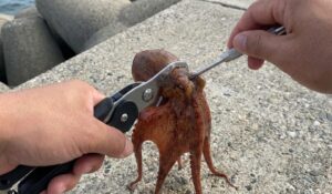 釣ったタコは地面(コンクリート)に置くか、タコばさみ(フィッシュグリップ)で頭(実際は胴体)をしっかりとホールドします。素手でやると吸盤で腕に張り付かれ、パニックになるので必ず手袋やグリップを使いましょう。