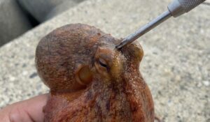 タコを逃がさないための第一歩であり、美味しく食べるための最大の秘訣が「活け締め(いけじめ)」です。 魚の神経締めと同じように、タコも釣った直後に素早く急所を突いて絶命させることで、鮮度の劣化を防ぎ、身の旨味成分(ATP:アデノシン三リン酸)を保持することができます。