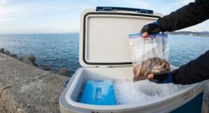 ポイント:この時、タコ(ジップロック)が直接、氷や保冷剤に触れないように注意してください。直接触れると「氷焼け(冷凍焼け)」を起こし、その部分の身がパサパサになってしまいます。
