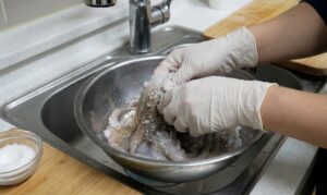 塩もみ地獄からの解放: 最も挫折しやすいヌメリ取りは、帰宅直後に無理をしてはいけません。内臓だけを取り、「一度冷凍してから」解凍して塩揉みする裏技を使えば、嘘のようにポロポロと汚れが落ちます。