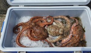 最後に、ジップロックに入れたタコをクーラーボックスに収納します。